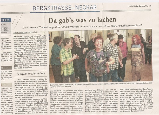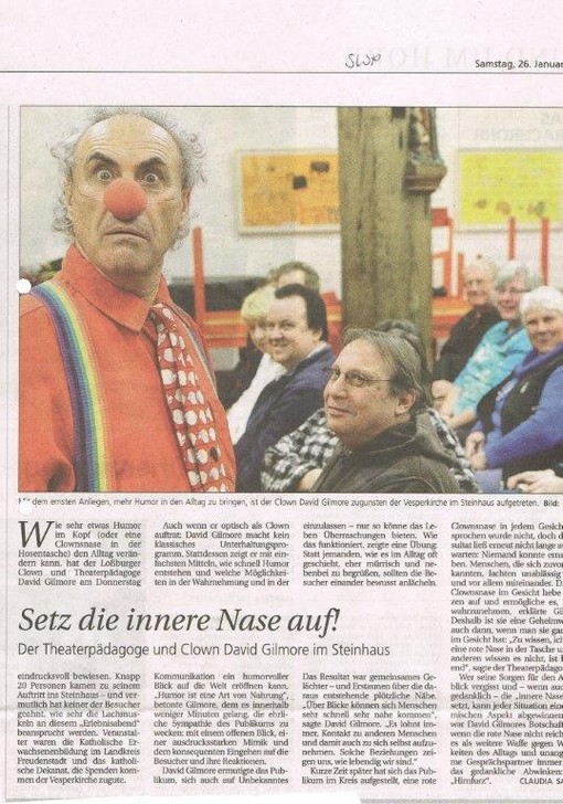 Die Freude im Alltag sei hierzulande ja schon geradezu verpönt. „Es gibt nur zwei Gründe, warum man sich in der Öffentlichkeit freut: Entweder man hat im Lotto gewonnen, oder man hat Geburtstag“, sagte Gilmore. Genau dem will Gilmore entgegenwirken, ohne Trauer und Negatives völlig auszublenden. So offenbarte der gebürtige Brite beim Vorlesen aus seinem Buch „Der Clown in uns – Humor und die Kraft des Lachens“ auch traurige und ernste Seiten seiner Vergangenheit. Trotzdem gelang ihm immer wieder der Bogen hin zu seinem grundlegenden Thema: Die innere Einstellung muss stimmen, die rote Clownsnase in der Tasche sollte nie vergessen werden. Erst dann wird Kurioses komisch, der verspätete Zug zum allerkleinsten Übel oder der nervige Tick zum persönlichen Running-Gag.